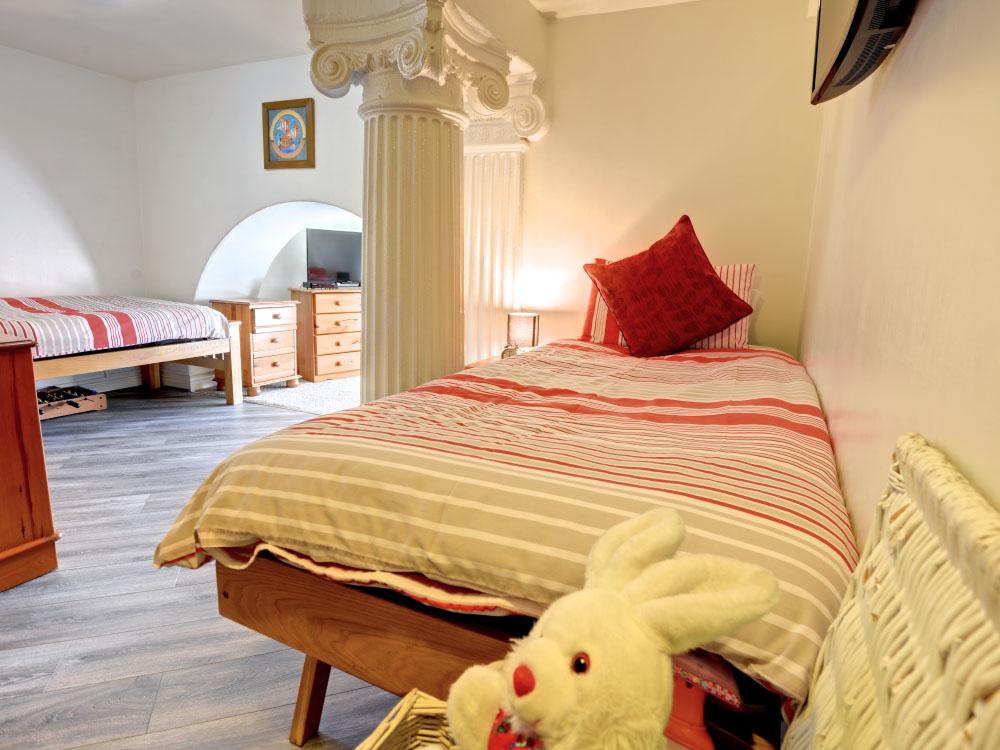 This apartment sleeps 4 in comfort but there is a pull out truckle mattress and a single futon for an extra child or two in the twin room.